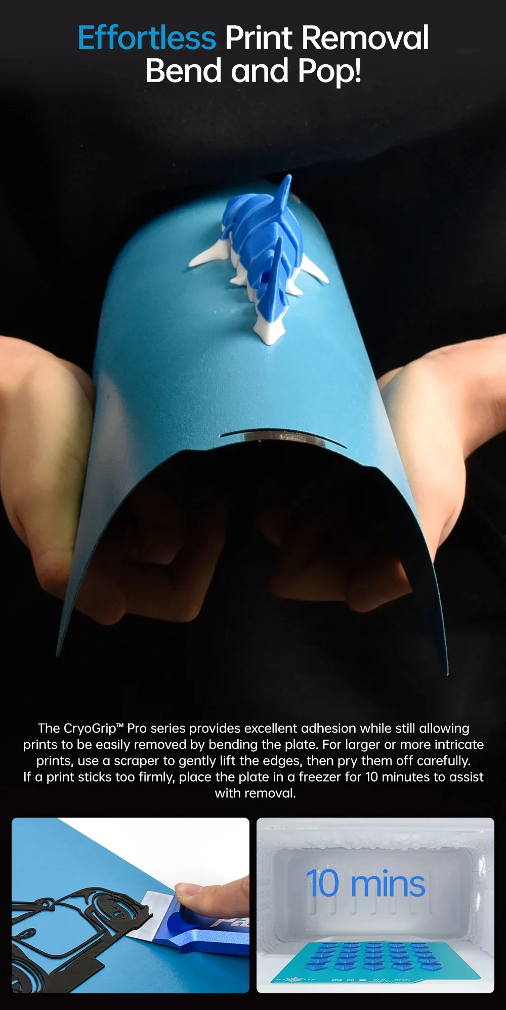 Gracias a su tecnología CryoGrip, las piezas se liberan fácilmente al enfriarse, evitando daños y mejorando la eficiencia del flujo de trabajo. Su resistencia térmica y mecánica la convierte en una opción ideal tanto para makers como para entornos profesionales.